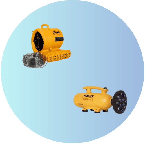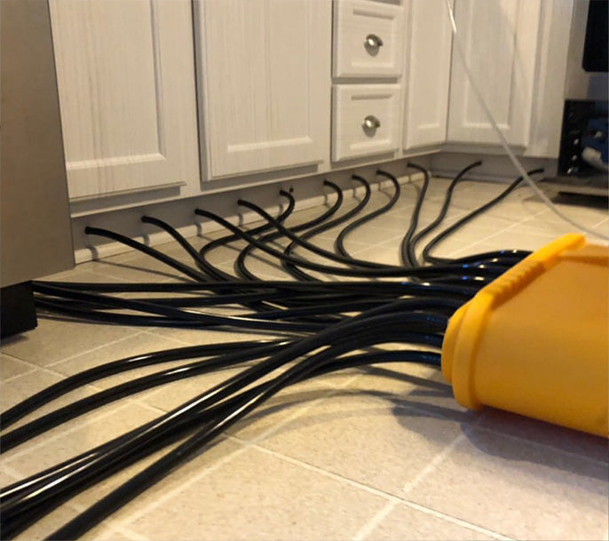 A wall cavity dryer forces heated, pressurized air into walls, ceilings, and cabinets to accelerate drying without demolition.